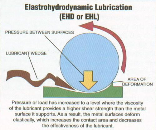 Elastohydrodynamic Lubrication (EHD or EHL) - Condition in which surfaces of rolling elements of high speed and high load components are either completely, or in part, separated by a very thin lubricant film. Mating parts deform elastically, due to incompressibility of the lubricant film under very high pressure and, therefore, trap or create a wedge of lubricant between them. This is similar to "hydroplaning" that cars exhibit on wet roads.