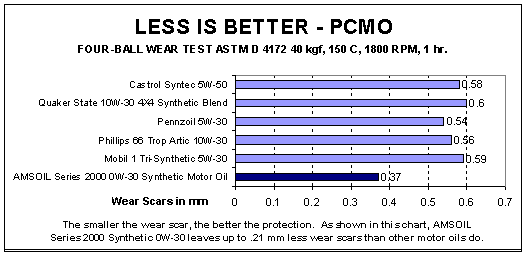 The following results from Four Ball Wear Tests will demonstrate how effective AMSOIL Synthetic Motor Oils are at wear protection compared to other popular oils. The Four Ball Wear Test is a lubricant industry standard (ASTM D 4172) test that compares relative wear prevention characteristics of new lubricants at specified conditions.